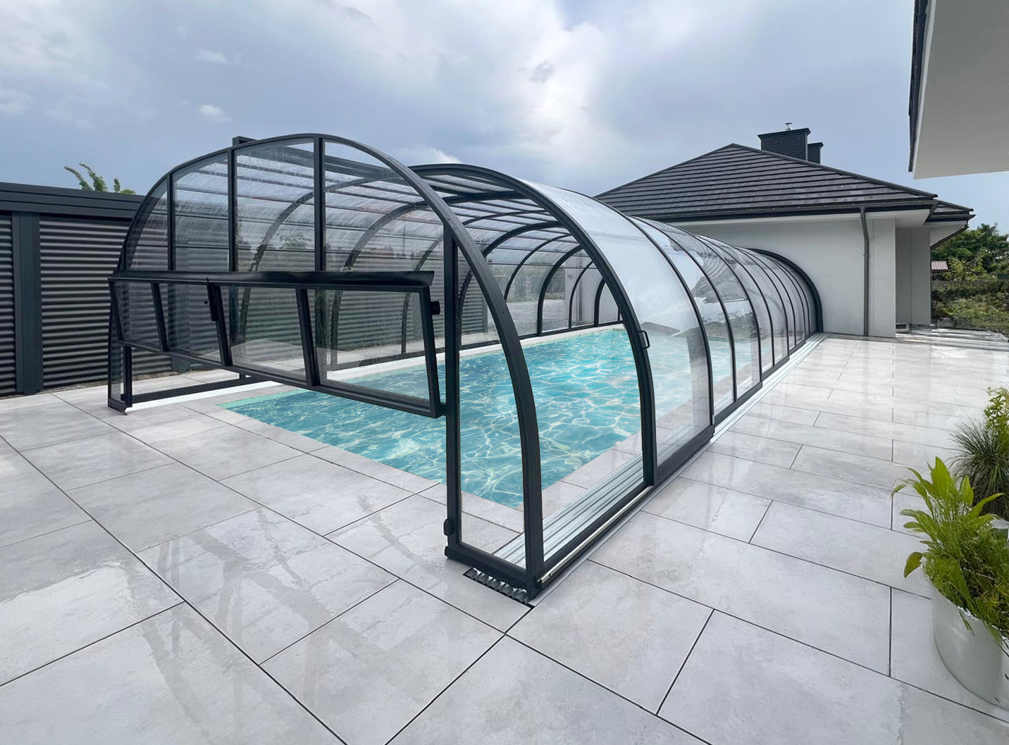 Zastosowanie klapy uchylnej jest również doskonałym sposobem na zwiększenie strefy kąpielowej, w przypadku gdy zadaszenie częściowo parkuje nad basenem.